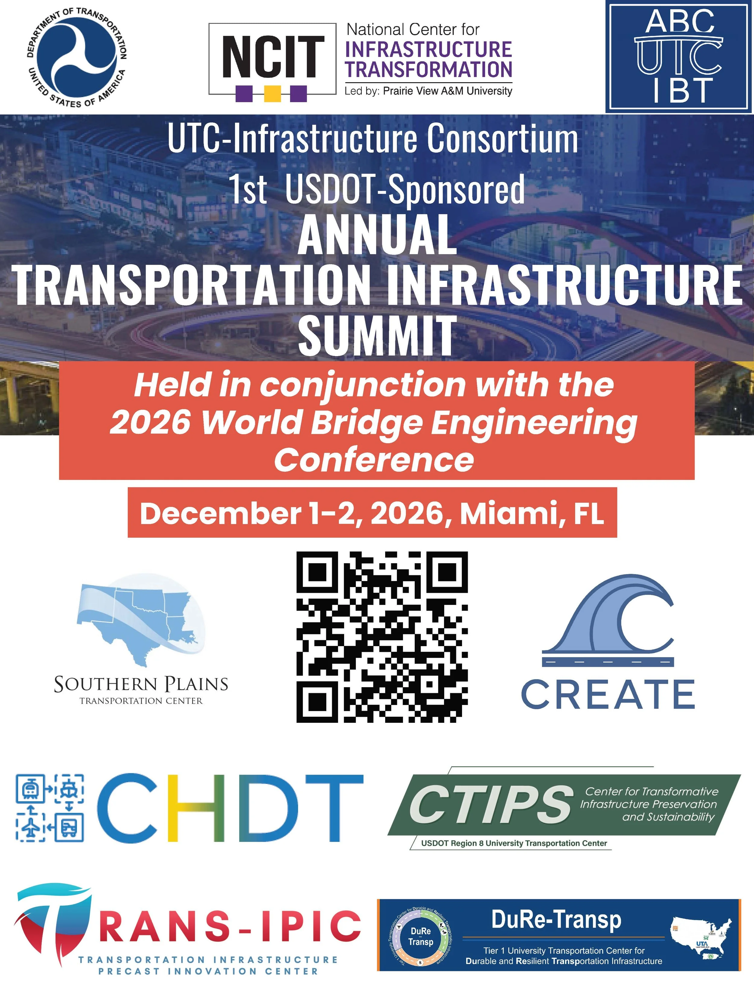 The first Infrastructure Focused University Transportation Center Symposium will be held in conjunction with the 2026 World Bridge Engineering Conference. Eight UTCs will showcase their most impactful research, workforce development, and technology transfer activities through a dedicated session track, poster session, live demonstrations, and a student competition.