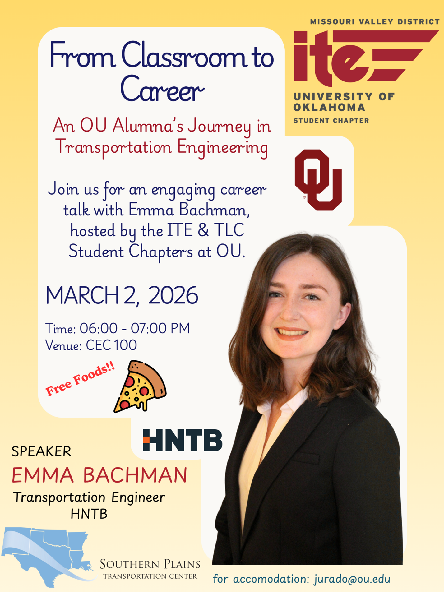The OU ITE/TLC Student Chapter recently hosted a guest talk titled “From Classroom to Career” featuring Emma Bachman, PE, a transportation engineer with HNTB and an alumna of the University of Oklahoma. The event brought together students interested in transportation engineering for a discussion about professional practice, career paths, and the transition from academic training to industry work.